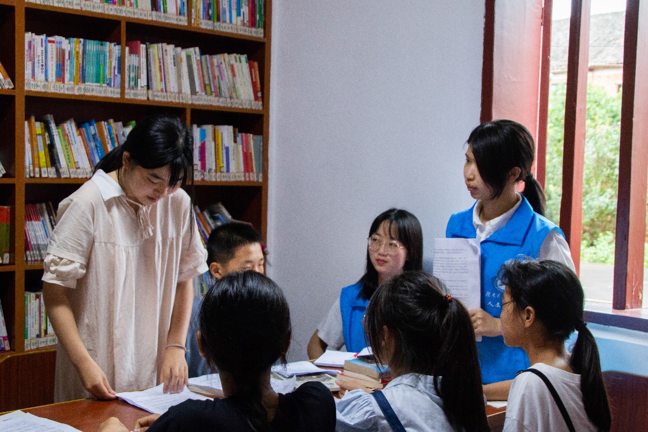 坐落在少儿假期学校附近的农家书屋在小雨中,更显别致。八年级同学们与支教志愿者刘楚怡围坐于书桌旁,杨莲金老师悄悄搬了一把凳子坐在角落,认真听着支教志愿者与同学们的发言,并鼓励每位同学勇敢地表达自己的观点。同学们从写作背景、人物形象、拓展想象三个方面谈及对《朝花夕拾》的理解。刘楚怡对同学们阅读这篇文章遇到的问题进行解答,并给他们分享了读书的三个方法——学会找到一本书的背景、学会找到一本书的主题、学会与一本书建立联系。