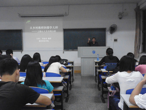 5月19晚,衡阳师范学院中文系朱迪光教授应邀来我院讲学,就“王船山从乡村教师到国学大师的人生历程”这一主题,进行详细讲解和剖析。我院学生及其他文学爱好者到场聆听。王友胜教授主持讲座。