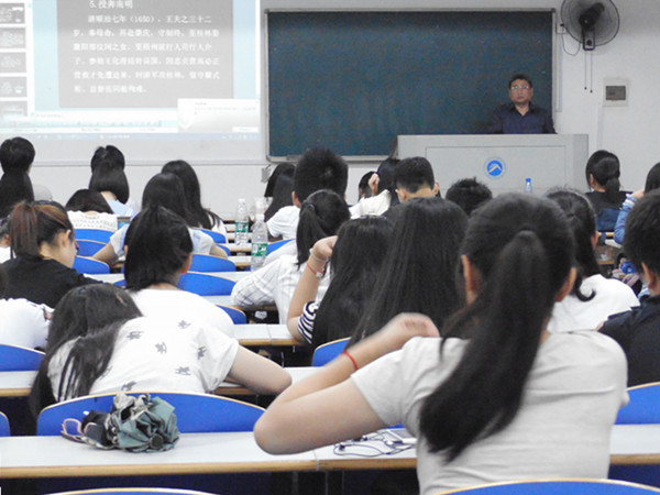 为了让同学们更加了解王夫之这一哲学家,朱教授首先放映了电视专题片《不灭的圣灯》,介绍了关于王船山的三个传说,深度解剖了他忠诚、高洁、有远见的性格特征。朱教授根据当代中国人的思想现状,反证王夫之不随波逐流的精神可贵之处。他认为,王夫之的朴实唯物主义和辩证法是中国哲学体系中的宝贵财富,而这一哲学思想也贯穿了船山先生的一生。