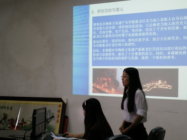 在介绍课题概况后,项目人郑文静对慈利县土家族传统文化活动板板龙灯的继承与保护进行了总体概述,详细阐述了其中存在的问题。胡铁强老师建议项目小组最好再对这一活动的文化起源做进一步调查,弄清板板龙灯整个历史发展传承过程。他鼓励小组向当地政府提出建立生态文化博物馆的建议,让板板龙灯的文化内涵保存更为完整。