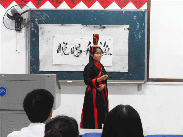 3号选手徐婵的表演则掀起了比赛的又一个高潮,只见她在黑板上挂好宣纸,回身蘸墨,挥笔写上“渔舟唱晚”四个大字,然后才不疾不徐地朗诵自己的篇目《滕王阁序》,配上《渔舟唱晚》的背景音乐,观众也被她的从容感染。徐婵说,为了练习好朗诵的语调,她准备了近两个星期,虽仍未达到令自己满意的程度,但能有这个展示的机会她就很开心。