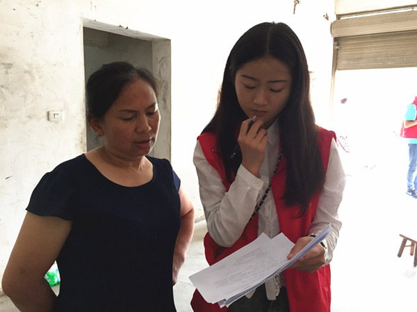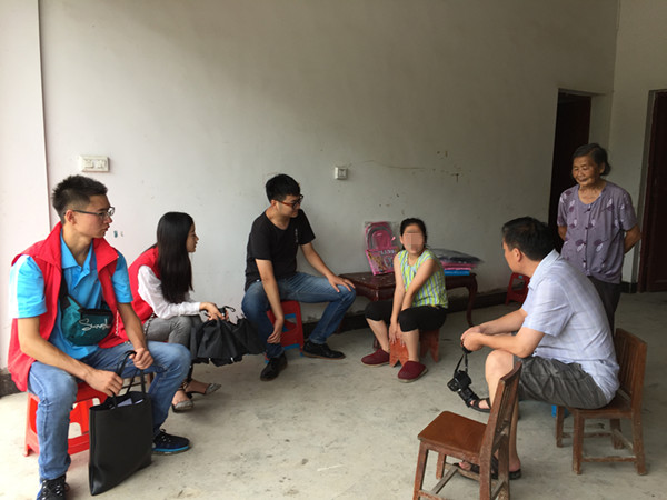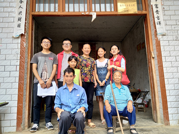 一个穿着绿色条纹衣服的女孩在村书记姚成庚的呼唤声中跑下楼来,带着羞涩的笑。这就是志愿者见到的第一个孩子——姚慧芝。“今年多大?上几年级啦?”钱子凡老师轻轻的摸了摸女孩的头。已上初中的女孩,面对志愿者们有些手足无措。外婆搬来了板凳,操着官话,与志愿者话家常。孩子的父亲去世了,妈妈独自在家做零工抚养俩姐妹……,谈及家里,这个饱经生活沧桑的老人微微耷拉下脑袋。“这一家人挺苦的,父亲一人承担所有开支,赡养年迈的老人,供养正在上学的小孩。”村长徐昌新说道。