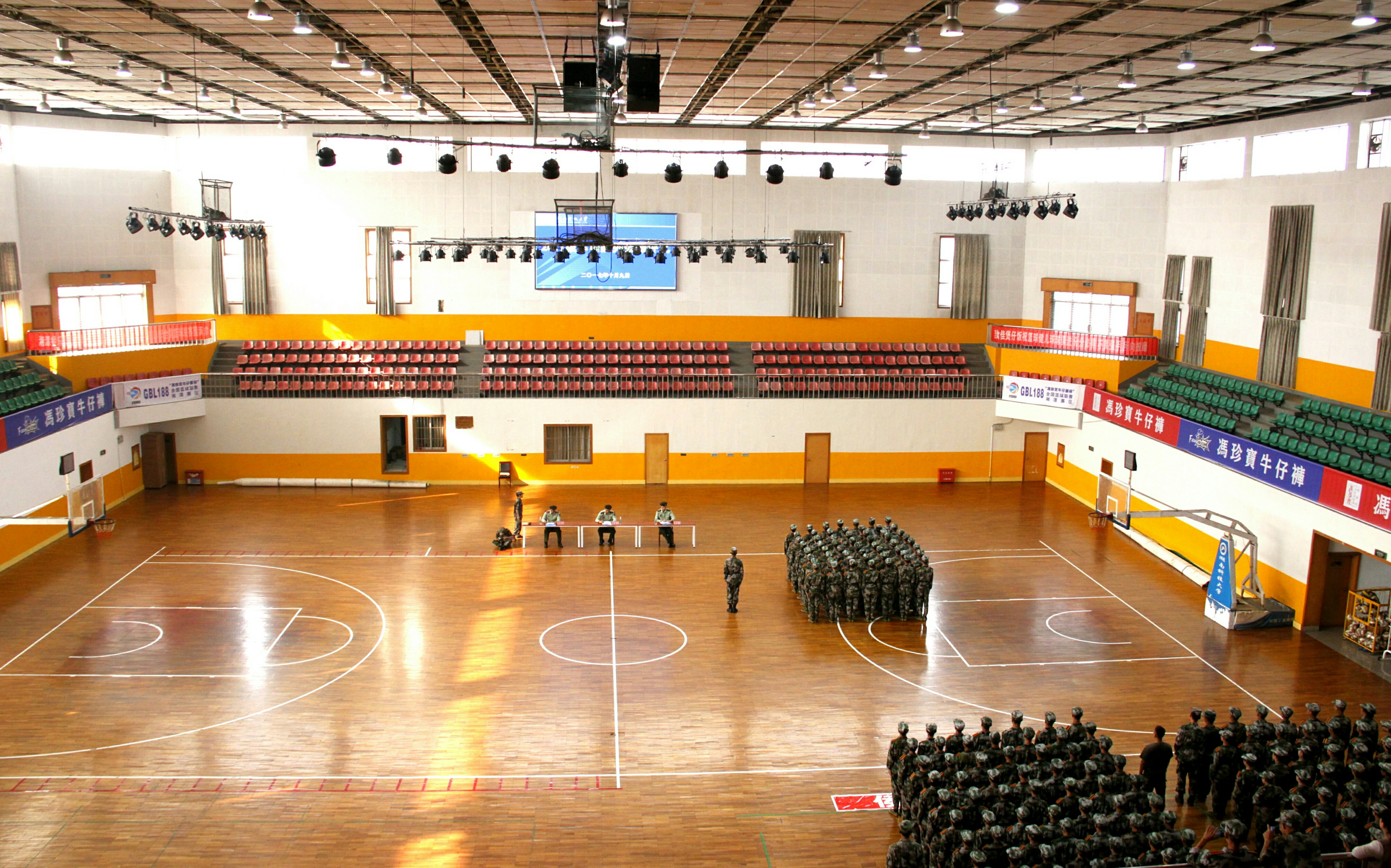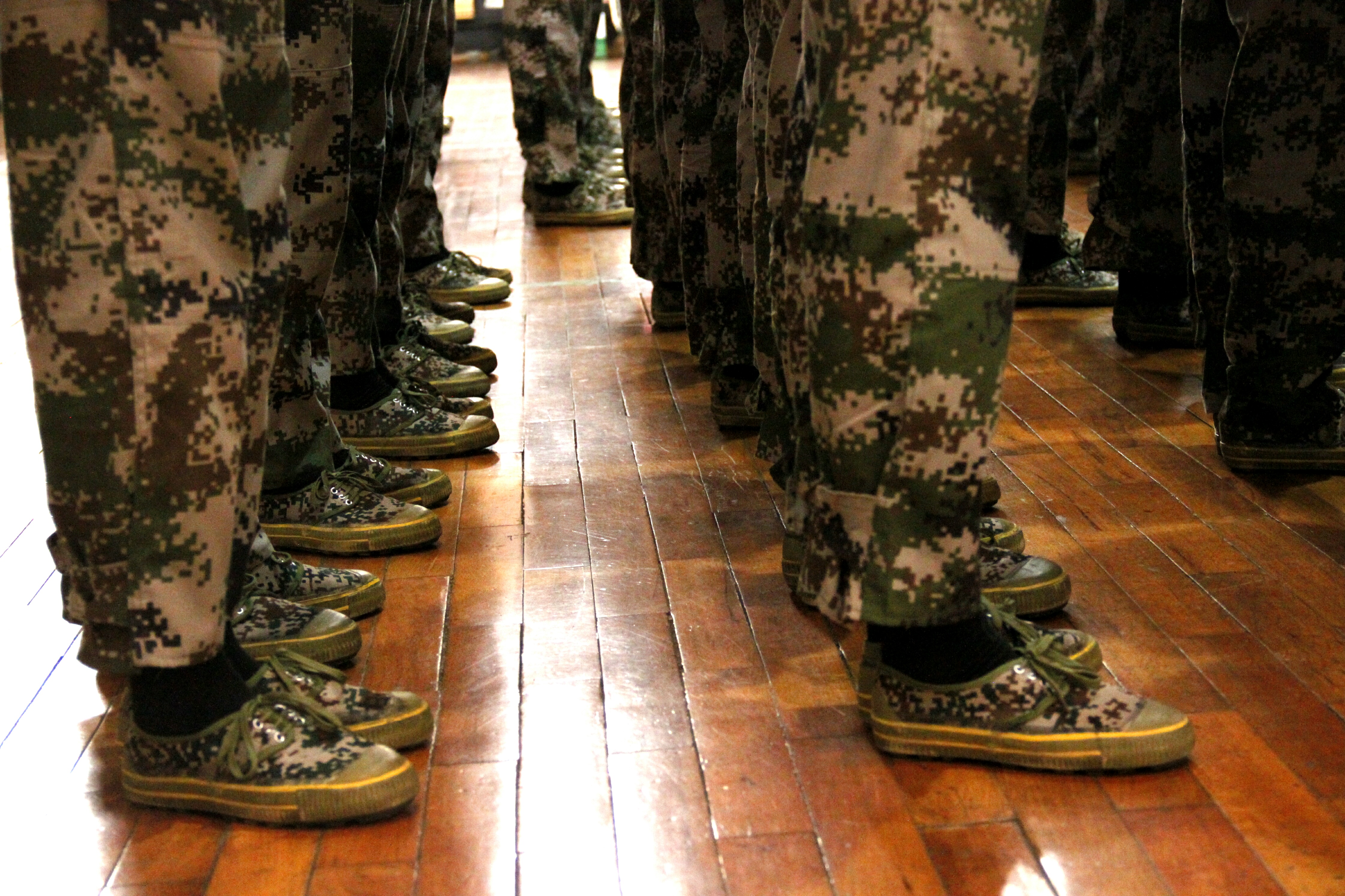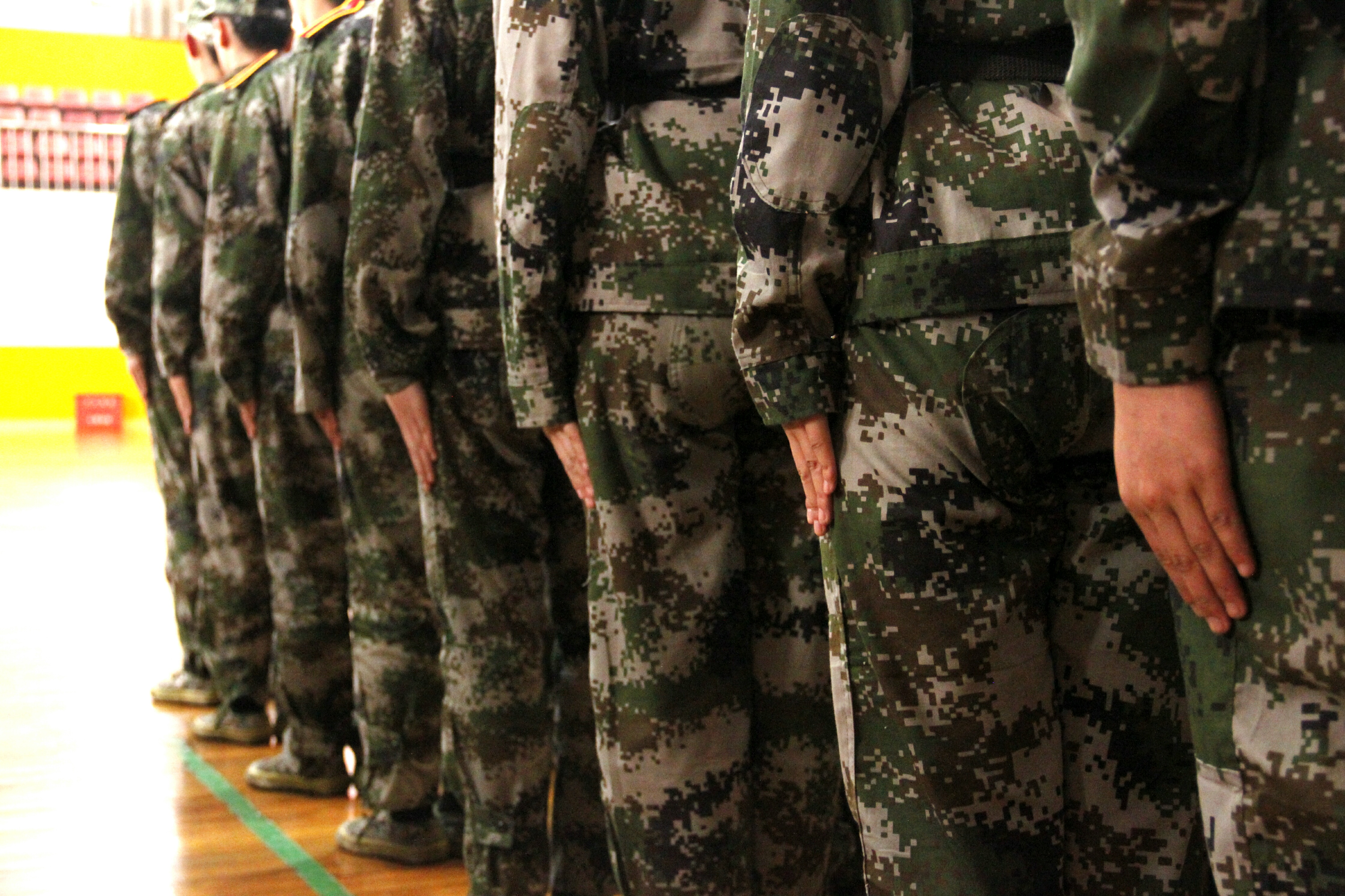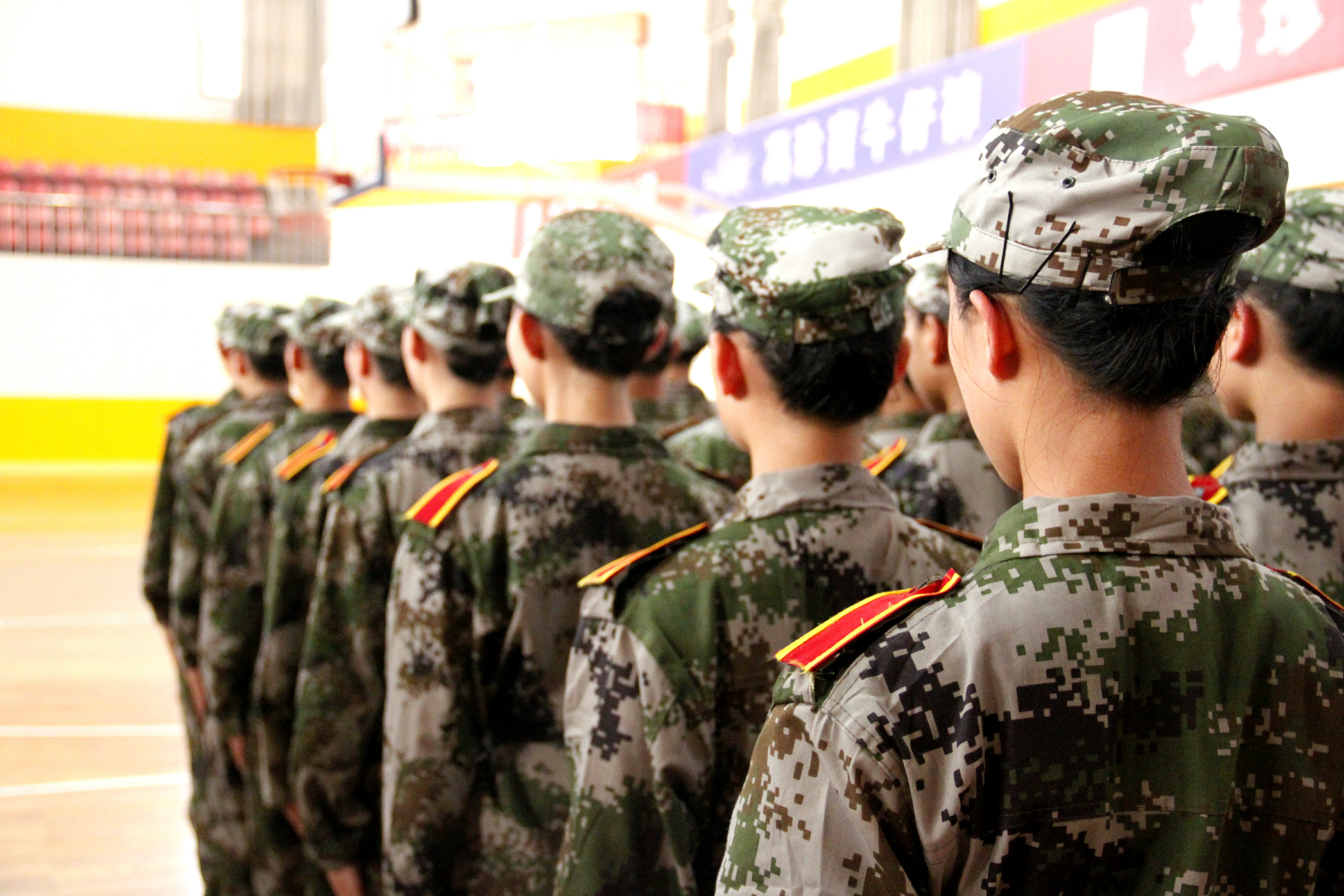 据悉,为保证比赛的客观公正,此次队列会操评比采取抽签的形式,并在评比结束之后公布各个学院的出场顺序。我院作为第三个出场的学院,学员们整装待发。北校篮球馆外,我院方阵队在尹教的带领下早早来到篮球馆外集结完毕,身穿迷彩服的方阵队成员们个个精神抖擞,表情严肃,在教官雄浑嘹亮的口号声中,步调一致地走进体育馆内。新生们整理着装,检查腰带,还不时互相检查军容,为这场队列会操评比做最后的准备。
