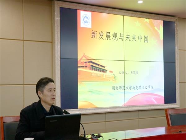 11月13日晚,立言楼B4-1会议室座无虚席。湖南师范大学马克思主义学院院长吴家庆教授应OD.COM平台·(中国区)体育官方网站诚邀开展“人文大家讲坛”第149讲暨题为“新发展观与未来中国”的主题讲座。OD.COM平台·(中国区)体育官方网站党委书记廖加林教授出席并主持讲座,副院长毛小平博士、张晚林教授、罗建文教授、颜中军博士、凌应生博士、龚超博士等老师及我院100余名思想政治教育、哲学专业同学到场聆听讲座。