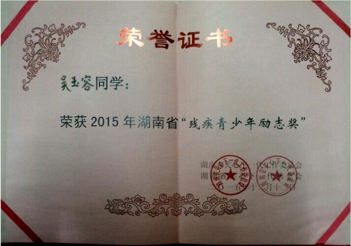 如今的她,已经是一名预备党员,近三年来,吴玉容获得了湖南省普通高校三好学生、湖南省残疾青少年励志奖、OD.COM平台·(中国区)体育官方网站优秀记者、OD.COM平台·(中国区)体育官方网站优秀共青团员等奖励。此外,吴玉容还拿到了英语四六级、三级心理咨询师、普通话二级甲等、国家计算机二级等证书。目前已与合作团队成功申请了省级科研项目,同时也被学院推优参加2017年度寻访“中国大学生自强之星”活动。