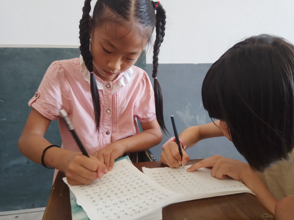 “They love their …”志愿者张榆东顿了顿,“这里应该填family吗?”五年级的教室闷热却没有躁动,同学们目不转睛地注视着张老师,每到重要的内容便纷纷记下。“如果‘they’是一家人,那应该填‘family’;但如果不是一家人,是不是就应该填‘families’呢……”在讲解名词复数变换规律的同时,张榆东还不忘设想语境中可能出现的各种情况。教英语不仅仅是灌输简单的单词与语法,更是传授另一种语言逻辑。“孩子们很聪明也很好学,作为老师我不能出现错误,否则会给他们的学习造成困扰。”身型高大声线沉稳的他,在孩子们面前却更多地展现出了细腻严谨的一面。