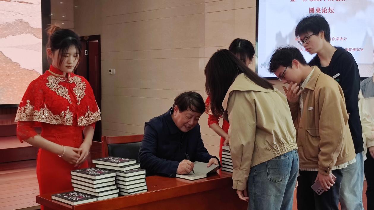 随后,谭谈、王跃文、水运宪、梁瑞郴、梁尔源、沈念以“作家眼中的创作”为主题开展圆桌论坛。圆桌论坛中,各位作家对写作发表了自己的见解。谭谈强调:“生活是创作的老师,生活虽然是平凡的,但我们要善于从生活中提取素材。”水运宪指出,感觉是一切文学艺术的底色,文学创作就是找到感觉、领悟感觉、表现感觉、把感觉变成文学作品去感动读者的过程。王跃文表示:“修辞手法、创作技巧是老师可教给你的,但感悟生活的能力确实不可教的。”梁瑞郴作为散文大家,在散文方面的造诣颇深,他表示要想写好散文,一定要注重积累,拥抱生活。梁尔源感慨道:“写诗是快乐的,但同时也是孤独的,因为灵感要与生活恰好相融才能写出好的诗歌。”