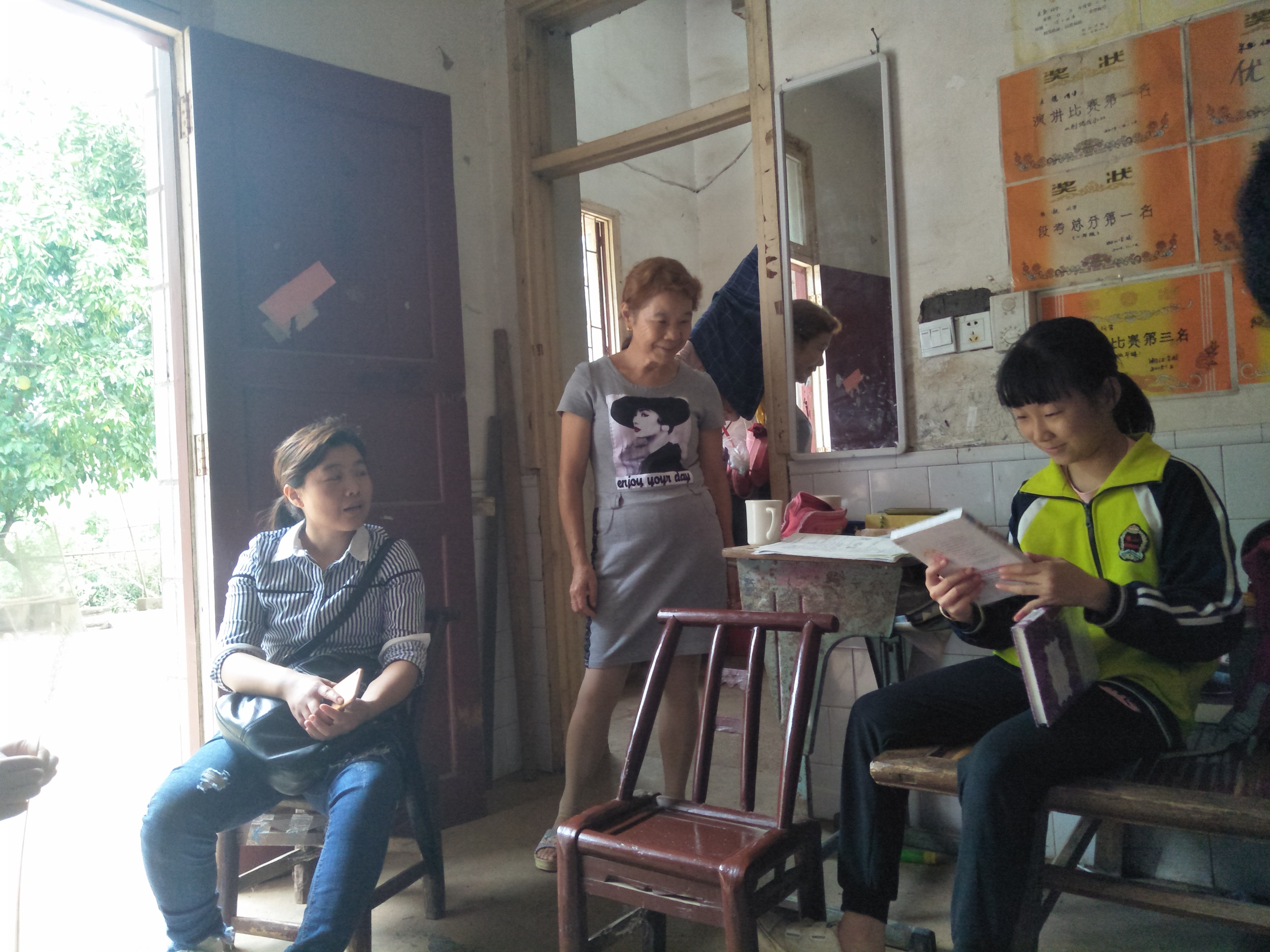 在卢书记口中,我们了解到,这九位孩子的家庭情况都不是很乐观,大都是低保户或者亲属卧病在床。其中有一对姐弟令我们印象十分深刻。他们家也是低保户,爷爷瘫痪多年,父亲患有三级肢体残疾,可以说家庭的经济来源并不宽裕。但还在上小学的姐弟俩却十分争气,我们一进屋就看到了满墙的奖状,金灿灿的像在发光。家庭的不幸没有击败他们,反而像是更坚定了他们的选择。当我们不禁为姐弟俩赞叹感慨时,姐姐笑着说还有一些奖状贴不下放在抽屉里了。姐弟俩确实十分优秀,从与我们的交谈中也可以看出他们很活泼外向,并没有我们想象中的那样害羞内敛。姐姐收到我们送的书时,非常开心,迫不及待地拆了开来,一直抱在手中左翻右翻。临走前,我们还互留了电话,希望我们能通过电话经常交流,利用语言沟通对他们进行心理疏导,及时关切到他们的心灵的深处。