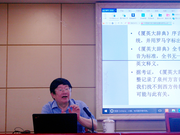 马重奇教授主要就分为闽方言西文文献产生的时代背景、闽方言韵书与西文研究文献的挖掘、中西闽方言文献的研究方法与思路这三个部分展开论述,马重奇教授以回顾历史的方式交待了闽方言西文文献产生的时代背景,从明代开始,天主教教士就开始取道东南亚进入福建。由于福建民众看不懂《圣经》,外国传教士便认真研究闽方言,编纂出福建各地方言的字典、辞书及研究著作供教士们学习。马重奇教授随之列举了大量福建各地方言韵书与西文福州方言研究著作,如福安方言韵书、闽南方言韵书、厦门方言字典辞书、闽南方言分支中的潮汕方言韵书等。马重奇教授列举语料之丰令在场老师也不由为之称奇,这些丰富的文献除去在全国各图书馆中找到外,还有许多是由马重奇教授在民间发现并重金购来。对于这些数量巨量的文献,马重奇教授分享了他的研究方法与思路。他常用的研究方法,除内部比证法,即关于内部寻找证据与从文本中寻找特殊韵部进行研究外,还有同期音韵数据比较法与历史比较法,他通过大量举例说明这些研究方法使场上师生对其分析方法有了具体的了解。